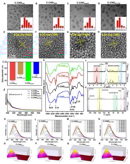 (A−D) TEM images (Bar = 10 nm), (E−H) HRTEM images (Bar = 2 nm), (I) Zeta potentials, (J) UV-vis spectra, (K−R) Excitation-dependent emission (Em) spectra, and (S) FTIR patterns of different C-CND. (T) 1H-NMR and (U) 13C-NMR spectra of C-CNDU87 and C-CNDHepG2. Data are represented as mean ± SD (n = 3). Yellow arrows: the d-spacing of C-CND.