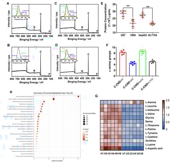 XPS patterns of: (A) C-CNDU87, (B) C-CND1800, (C) C-CNDHepG2, and (D) C-CNDHL7702. Insert: P1s spectra of corresponding C-CND. (E) BCA assay of the total protein content of different types of cells. Data are represented as mean ± SD (n = 6). (F) The number of α-amino groups on the different C-CND. Data are represented as mean ± SD (n = 6). (G) The amino acid analysis in cancer cell lysates, H: HepG2 cell, U: U87 cell. (H) The metabolic pathways associated with amino acids of Figure 2G. Notes: ** p < 0.01.
