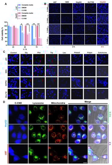 (A) Cell viability of U87 cells and HepG2 cells incubated with complete media, DMEM (FBS and glucose free media) and 4 mg/mL of C-CND dispersed in DMEM (U87 cells incubated with C-CNDU87, HepG2 cells incubated with C-CNDHepG2) for varied time periods. Data are represented as mean ± SD (n = 4). Confocal fluorescence images of tumorous (HepG2 and U87) and normal (1800 and HL7702) cells incubated with different C-CND (80 µg/mL) for (B) varied time periods (Bar = 100 µm) and (C) being pretreated with Gly, Phe, Trp, Leu, PhAsO, filipin, and colchicine, followed by incubation with corresponding C-CND (Bar = 50 µm). (D) The subcellular localization of the C-CND (80 µg/mL) with different organelles. Green: lysosome. Red: mitochondria. Blue: C-CND. Bar = 10 µm. Notes: * p < 0.05; ** p < 0.01.