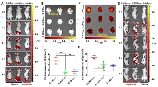 Tumor-bearing models of nude mice including U87 orthotopic glioma and HepG2 subcutaneous hepatoma were administered with 100 µL C-CND (50 mg/kg) through the tail vein after an overnight fast. At the estimated time points (0, 1, 2, 3, and 4 h), the trends of fluorescence accumulation in mice were observe using an IVIS Spectrum in vivo imaging system (Caliper, MA, USA) under a general anesthetic (3% isoflurane flow). At the 3 h post-injection, one mouse of each group was sacrificed. Tumor tissues and main organs were collected and imaged for the distribution of C-CND in vivo.