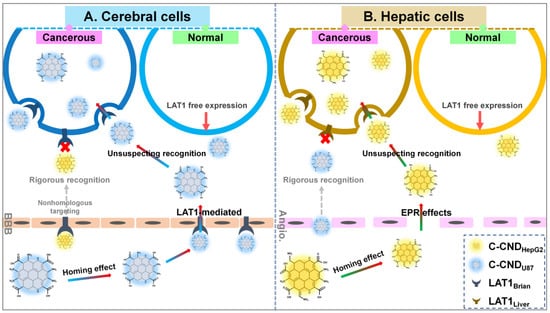 Schematic diagram of in vivo imaging of the tumor cell-derived C-CND. (A) C-CNDU87 mediated fluorescence targeted imaging for glioma across the BBB; (B) C-CNDHepG2 mediated fluorescence targeted imaging for hepatic carcinoma. BBB: Blood–brain barrier, Angio.: Tumor angiogenesis.