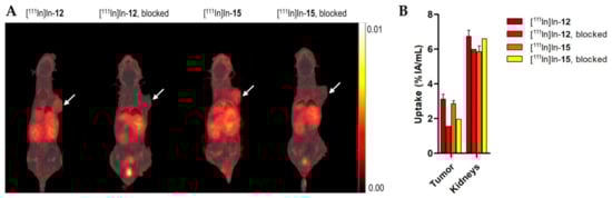 SPECT/CT imaging of [111In]In-12 and [111In]In-15 in PC-3-xenograft Balb/c nu/nu mice, 2 h p.i. (A) SPECT/CT images: overlay of a CT slice and the corresponding SPECT slice, on which the tumor cross-section is distinctly visible. The tumor is located on the right shoulder (white arrow). For the non-blocked groups, one representative image is shown. (B) Radioactivity uptake in tumor and kidney volumes of interest, determined from SPECT images, is expressed as a percentage of injected activity per mL (%IA/mL). The values for the unblocked groups are recorded as mean ± SD (n = 3).