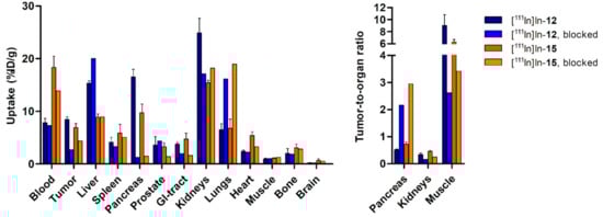 Ex vivo biodistribution (left) and tumor-to-organ ratios (right) of [111In]In-12 and [111In]In-15 in PC-3-xenograft Balb/c nu/nu mice after SPECT/CT scanning. Mice were injected intravenously with 1 nmol of [111In]In-12 or [111In]In-15, alone or in combination with 150 nmol of non-labeled NeoB (blocked). Radioactivity uptake in tissues was calculated as a percentage of the injected dose per gram of tissue (%ID/g). Data for the unblocked group are presented as an average value ± SD (n = 3).