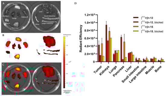 Ex vivo fluorescence imaging of a subset of organs. A representative example of (A) a photograph (organ tags in white), (B) a fluorescence image, and (C) their overlay, obtained with IVIS imaging of [111In]In-15 in PC-3-xenografted Balb/c nu/nu mice after dissection. The scale bar shows the fluorescent signal intensities in radiant efficiency {(p/sec/cm2/sr)/(µW/cm2)}. (D) Quantified ex vivo radiant efficiencies of [111In]In-12 and [111In]In-15 uptake in tumor and organs (non-blocked (n = 3); blocked (n = 1)). Values for the unblocked group are presented as an average value ± SD.