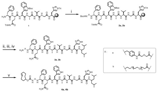 Synthesis of 4a and 4b. Reagents and conditions: (i) linker a or b, HBTU/Oxyma Pure, DIPEA, 2 h, rt; (ii) HFIP/DCM, 1 h, rt; (iii) PyBOP, DIPEA, 4-amino-2,6-dimethylheptane, DMF, 1 h, rt; (iv) TFA/H2O/TIS, 1 h, rt; (v) TCO-NHS, Et3N, H2O/ACN, 1 h, rt.