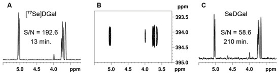The sensitivity gain using 99% 77Se-enriched SeDGal ([77Se]DGal) versus the nonenriched specimen (SeDGal) was checked via comparative 2D 1H-77Se CPMG-HSQMBC experiments. Figure 1 shows two sets of data corresponding to [77Se]DGal (A) and SeDGal (C), respectively, in terms of signal to noise (S/N) ratios and times of data acquisition (Acq) for samples of equal concentrations. The overall sensitivity improvement calculated from the experimental data in Figure 1 is 13.21 in terms of unit acquisition time (Equation (1)):