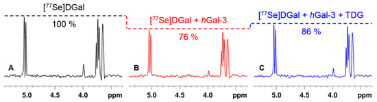 To demonstrate the usefulness of 77Se-enriched ligand in binding experiments, Figure 2A shows the 1D cross section from a 3-minute 2D 1H-77Se CPMG-HSQMBC experiment of [77Se]DGal (2 mM). This spectrum conveys the reference (100%) signal intensity. It is noteworthy that the S/N ratio is more than adequate in this 3-minute spectrum, leaving room to reduce the concentration of the ligand (and, consequently, that of the protein) in these experiments. The addition of human galectin-3 (hGal-3, 29 μM) to this sample resulted in a decrease in signal intensity (from 100% to 76%, Figure 2B) by line broadening, which indicated binding of the ligand to the protein [25]. The line broadening in Figure 2B was then partially reversed (from 76% to 86%, Figure 2C) with the introduction of thiodigalactoside (TDG, 2 mM) to the sample. This phenomenon is a consequence of reduced relaxation enhancement of [77Se]DGal resonances via competition between the two ligands (TDG and SeDGal) for the same recognition site on hGal-3, as explained earlier [25]. It also illustrates that [77Se]DGal can be used via its competitive displacement to indirectly monitor the binding of even non-selenated compounds to hGal-3 (or any other target proteins) by our sensitivity-optimized 1H-77Se CPMG-HSQMBC method.