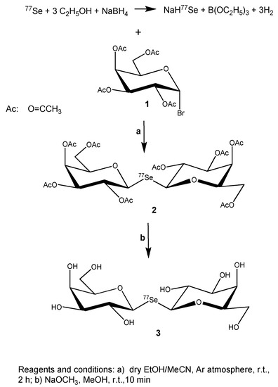 Preparation of this compound was based on the reaction of 1-Br-2,3,4,6-tetra-O-acetyl-α-D-galactopyranose (1) with NaH77Se, with the latter obtained by NaBH4 reduction of elemental selenium [33] 99% enriched in 77Se isotope. Reaction of (1) with NaH77Se furnished 77Se-enriched octa-O-acetyl-di(β-D-galactopyranosyl)selenide (2), which gave the desired product, 77Se-enriched selenodigalactoside ([77Se]DGal 3), upon Zemplén deacetylation (Scheme 1). This two-step synthesis was carried out with a good overall yield; further details of the reactions are given in Section 2.