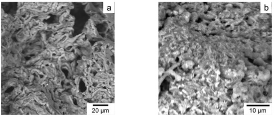 The results of scanning electron microscopy indicate different surface morphologies of the copolymer and nanocomposite with AgNPs (Figure 6). The copolymer is characterized by a highly porous surface with numerous channels 4–15 µm in diameter (Figure 6a). The surface morphology of the AgNPs nanocomposite became denser (Figure 6b).
