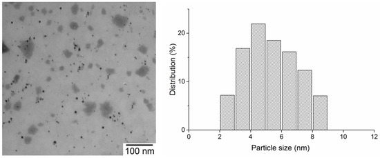 According to transmission electron microscopy data, AgNPs formed in a poly(VT-co-Na-VSA) matrix have a predominantly spherical shape with a size of 2–9 nm and a uniform distribution (Figure 7).