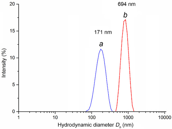 Histogram of the distribution over the hydrodynamic diameter Dh of the scattering particles for the initial copolymer (a) and the AgNPs nanocomposite (b).