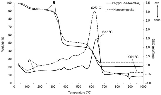 Thermogravimetric (a) and differential scanning calorimetry (b) curves for the starting poly(VT-co-Na-VSA) and AgNPs nanocomposite.