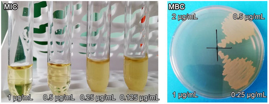 The nanocomposite was most effective against P. aeruginosa, the growth of which was suppressed at a low concentration of 0.25 μg/mL. The MIC and MBC values of the AgNPs nanocomposite in relation to the Gram-negative bacteria E. coli (ATCC 25,922) were 0.5 and 1.0 μg/mL, respectively (Figure 10).