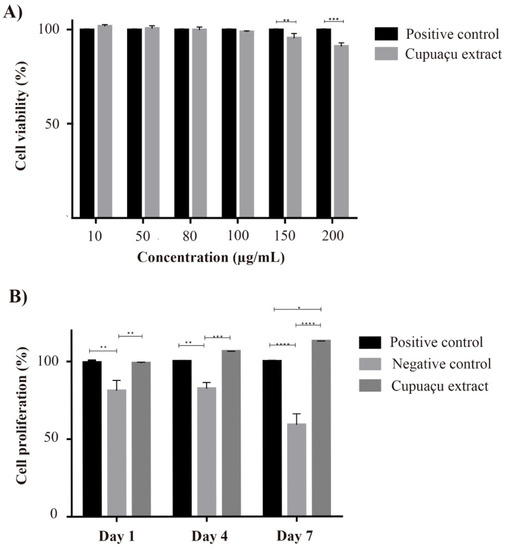 Primary human dermal fibroblast response to Cupuaçu extract treatment. (A) Cellular viability after 24 h incubation with different concentrations of Cupuaçu extract; (B) cellular proliferation for up to 7 days incubation with 100 μg/mL Cupuaçu extract. The graphs represent the absorbance mean value and standard deviation of three biological replicates in triplicates, normalized according to the 100% viability/proliferation positive controls. Positive controls received FBS supplementation and negative controls consisted of cells maintained without FBS supplementation. Statistical differences have been verified by two-way ANOVA test and Tukey post hoc test. * p < 0.05; ** p < 0.01; *** p < 0.001; **** p < 0.0001.