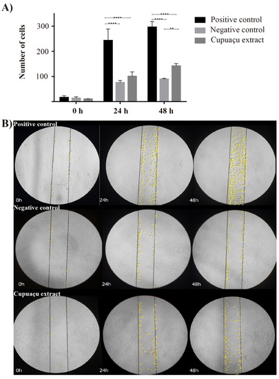 The Cupuaçu extract’s effect on the migratory behavior of fibroblasts was analyzed as described in Liang et al.’s protocol [22]. Briefly, cells were plated at a density of 2.5 × 105 cells/mL in 6-well plates. After reaching 100% confluence, the wells were scratched using a 200 μL pipette tip. The cultures were washed to remove cell debris and treated with either basal medium containing growth stimuli (i.e., untreated samples for positive migration control) or 100 μg/mL Cupuaçu extract. FBS was removed to decrease the stimulation of cell proliferation, as it may influence experimental outcomes. The cultures were incubated at 37 °C and photographed immediately after the assay and 24 and 48 h later. Wound closure was evaluated using ImageJ (Wayne Rasband, NIMH, Washington, DC, USA), and cell migration ability was measured as per the action of the compound to promote such effect, considering the number of cells that had migrated into the assayed area. A minimum of three independent experiments was executed.