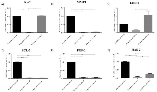 Effect of the Cupuaçu seed extract on the mRNA levels of (A) Ki-67, (B) MMP-1 (matrix metalloproteinase-1), (C) Elastin, (D) BCL-2, (E) FGF-2 (fibroblast growth factor-2), and (F) HAS-2 (hyaluronic acid synthase-2) genes. Positive control represents cells maintained in basal medium with FBS, and negative control maintained in the absence of FBS. Statistical differences were verified by two-way ANOVA test and Tukey post hoc test. * p < 0.05; ** p < 0.01; *** p < 0.001, **** p < 0.0001.