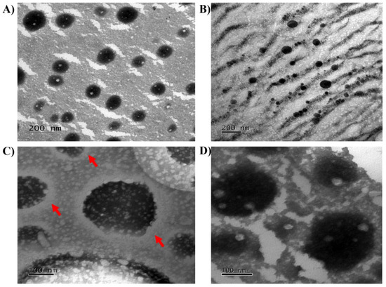 Photomicrographs obtained by TEM. (A) Blanc NC (20 K); (B) Blanc NC-CH (20 K), (C) NC-CH (15 K) and (D) NC (15 K). Red arrows represent a “white halo” around the chitosan-coated nanocapsules.