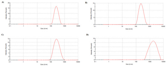 The morphology of polymeric nanocapsules was analyzed by transmission electron microscopy (TEM, model JEM 1011, Tokyo, Japan). The samples were diluted in a ratio of 1:200 (v/v), placed in gold gratings to be covered with “formvar” resin, and left drying at room temperature. Next, the excess formulation was removed with filter paper. After this step, 3 μL of 3% (w/v) uranyl acetate solution was added and allowed to dry, protected from light for 5 additional min at room temperature. Again, the excess solution was removed with filter paper, and the sample was analyzed in the equipment.