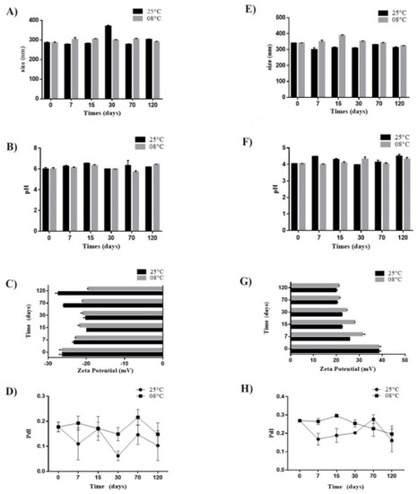 Evaluation of average size, pH, zeta potential, and PdI for NC (A–D) and NC-CH (E–H) stored at 8 ± 3.0 °C and 25 ± 2.0 °C, over 0, 7, 15, 30, 70, and 120 days.