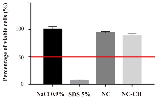 Skin irritation was also evaluated using reconstructed human epidermis (RHE) provided by EpiSkin™, according to [25] OECD guidelines described as test n. 439 in 24-well plates. The samples tested in this study were NC, NC-CH, potentially irritating positive control (5% sodium dodecyl sulfate solution, SDS 5%), and potentially non-irritating negative control (0.9% sodium chloride solution, NaCl 0.9%) (n = 3). Cell viability was measured by MTT (1 mg/mL) reduction in a microplate spectrophotometer at 570 nm (Bio-Tek PowerWave model HT, Winooski, VT, USA). For this protocol, a substance was determined as irritating when the percentage tissue viability—assessed by MTT assay—was less than or equal to 50% and as non-irritating when this percentage was above 50% [26].