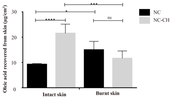 Penetration of oleic acid in burnt and intact skin samples treated 24 h with NC or NC-CH. ns non significant; * p < 0.05; *** p < 0.001, **** p < 0.0001.