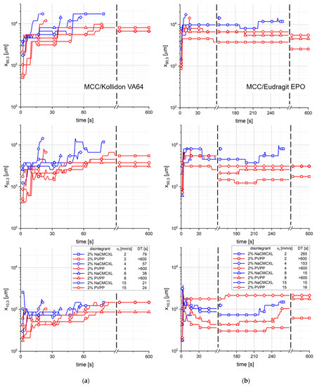 - Rajkumar, A.D.; Reynolds, G.K.; Wilson, D.; Wren, S.; Hounslow, M.J.; Salman, A.D. Investigating the effect of processing parameters on pharmaceutical tablet disintegration using a real-time particle imaging approach. Eur. J. Pharm. Biopharm. 2016, 106, 88–96. [Google Scholar] [CrossRef] [PubMed]