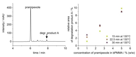 HPLC chromatogram (left) of 5% (w/w) pramipexole filament and evaluation of the relative area degradation product A of the pramipexole peak (right) of three different pramipexole concentrations (1, 2.5, and 5% (w/w)) exposed to 130 °C in DSC for 15, 22.5, and 30 min.