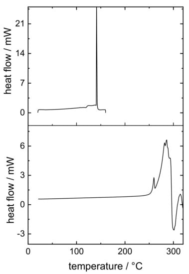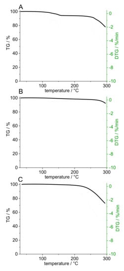 Thermal analysis (n = 2) was conducted using a thermal analyzer (TG 209 F3 Tarsus®, Netzsch, Selb, Germany). The experimental TG sample carrier type S was equipped with a supporting PtRh10-Pt thermocouple to display thermal events during heating in nitrogen atmosphere. The temperature range was set from 30 °C to 300 °C, and the heat rate was 10 K/min.