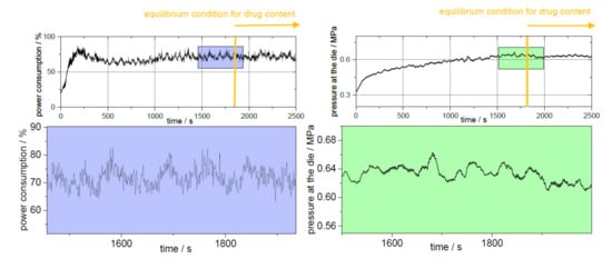 Steady-state conditions of process parameters of extrusion setup “physical mixture” of PVA-P (left: power consumption; right: pressure at the die) with the time-delayed starting of the equilibrium condition for drug content.