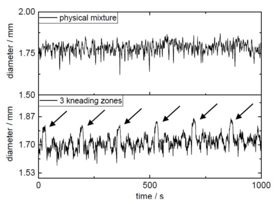 Diameter fluctuation of extrusion setups “physical mixture” and “3 kneading zones”.
