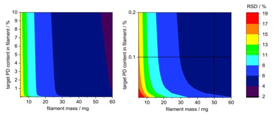 Contour plots for limitations of deviations calculated by Stange–Poole equation: (left) colored RSD of PD target concentration depending on target PD content in filament (from 0–10%) and filament mass (0–60 mg); (right) RSD from selected filament mass (50 mg) with predetermined PD concentration in filament (0.1% (w/w)).