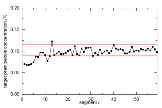 The calculation of the RSD was performed according to Equation (3) for sample sizes between 5 and 100 mg filament in 0.01% steps for pramipexole content from 0.01 to 10% (w/w) and is graphical illustrated in a contour plot for sample sizes between 0 and 60 mg (Figure 6). To verify the applicability of the contour plot, we examined higher loaded filaments with respect to the deviation of the content in different sample sizes. As Figure 6 indicates, the RSD decreased with increasing sample size. This was true for both 1 and 5% (w/w) pramipexole-loaded filaments, which were selected to verify the feasibility of this method (Table 7). The contour plots showed that the standard deviation for the respective sample size was the same for both filaments, although the loading with API varied. For all tested sample sizes, the RSD was within the calculated limits of the Stange–Poole equation or even lower. Thus, for 0.1% (w/w) loaded filaments, a similarly small RSD had to be maintained. For the determination of content uniformity, the sample size was depicted to be 50 mg, which means that with a drug load of 0.1% (w/w), the RSD must not exceed 6%. To test whether the limit of ±6% calculated by the modified Stange–Poole equation could be met, we selected the extrusion “granule feeding” to show in equilibrium state for content uniformity whether the deviations were within the allowed range. Since the physical mixture of granules was fed with the help of only one dosing unit, the limits could be complied in equilibrium conditions after filament segment 15 (Figure 7). In equilibrium condition for drug content, 100% of the measured filament fragments were within the set limits (after segment 15).