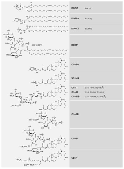 Chemical structure of the cationic lipids considered in this study. DOGB, dioleyl glycine betaine; DOPIm, dioleyl phosphoramide imidazolium; DOPAs, dioleyl phosphoramide arsonium; DOSP, dioleyl-succinyl paromomycin; CholIm, cholesterol imidazolium; CholAs, cholesterol arsonium; CholT, cholesterol tobramycin; CholK, cholesterol kanamycin A; CholKB, cholesterol kanamycin B; CholRi, cholesterol ribostamycin; CholP, cholesterol paromomycin; GL67, Genzyme (Cambridge, MA, USA) lipid 67 [,,,,,].