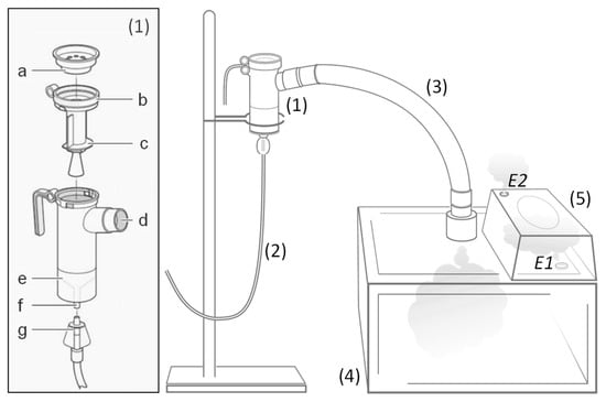 Aerosol experimental set-up. The illustration shows the clinically-validated PARI LC PLUS nebulizer (1) (comprising: a, inspiratory valve cap; b, insert; c, semi-circle; d, outlet; e, reservoir; f, air intake; g, wing tip tubing) connected on one side to a flexible hose (supplying two bars pressurized air) (2) and on the other side to a 55 cm tube (3) conducting the aerosol generated to a Perspex box (4) where mice were housed. Via an exit, E1, the aerosol reached a second compartment (5) fitted over the cover of the exposure box. This second compartment made it possible to expose other materials and to collect a sample of the aerosolized formulation. The aerosol finally left the system via an exit, E2. See Figure S1 for more details about the set-up. A video showing an aerosol experiment in mice is available from (“Aerosol in mice.mp4”). https://susy.mdpi.com/user/submission/video/916a160f3cc7e836c26793ade8089553 (accessed on 29 November 2021).