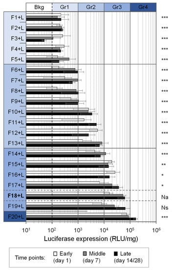 Luciferase activity in lung homogenates at three time points following aerosol treatment with various lipid + pGM144 formulations. Results correspond to means +/− SD, with n = 5 mice/group i.e., at each time point. The dashed vertical line specifies the luminescence background (Bkg, as determined with naive mice, ~102 RLU/mg protein). Formulations are numbered from F1 to F20, according to the MLE (see Table 3 legend). Results for F11 + L, F12 + L, and F16 + L were not determined on day 7. The statistical significance determined when comparing the MLE of a given formulation with that of GL67A is indicated as follows: ***, p-value < 0.0005; **, p-value < 0.005; *, p-value < 0.05; Na, not applicable; Ns, non-significant.