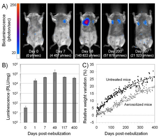 (1) Firstly, a long-term longitudinal follow-up was performed with mice treated with an aerosol of [(CholP/DOPE 1/2 DP5K) + pGM144] CR2 PR2. Seven days after treatment, luminescence was strong enough (i.e., ≥104 RLU/mg of protein []) to be detected from living animals via whole-body animal imaging (Figure 5A and Figure S4). The luminescence was collected from the surface of the chest area, forming a single or two distinct patches likely originating from the right and the left lung lobes, respectively. BLI was further detailed with measurements performed on organs harvested at several time points (i.e., 1, 7, 49, 117, and 400 days after aerosol treatment), confirming that the reporter gene expression could be detected in the lungs but not in any other body part (Figure 5B and data not shown). Furthermore, BLI as well as luminescence measurements in lung homogenates both showed that transgene expression increased after treatment, reached a peak (>105 RLU/mg) about 50 days later, and then remained stable (at about 5 × 104 RLU/mg) until the end of the experiment. Thus, a single aerosol treatment with this formulation was able to mediate sustained luciferase transgene expression in murine lungs for as long as 400 days (a duration that may be even longer, potentially reaching the lifetime of BALB/c mice i.e., about 2 years; for ethical reasons, it was not possible to monitor the animals for a longer duration). During this period of time, the animals continued growing; they showed on average a slight but persistent growth delay compared with the untreated mice, which could not be explained in this study (Figure 5C).