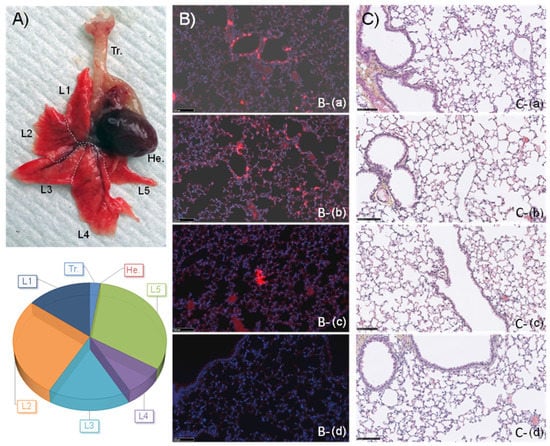 Luciferase expression in lungs 7 days after treatment of mice with an aerosol of F20 + L ([(CholP/DOPE 1/2 DP5K) + pGM144] CR2 PR2). Panel (A) illustrates the distribution of luminescence in lung lobes (L1–L5), heart (He.), and trachea (Tr.). Dashed white lines are used to help individualize the different lobes. The heart was used as a negative control for transfection. Panel (B) corresponds to immunohistochemistry analyses for luciferase detection in treated (Ba–Bc) compared to untreated (Bd) lungs. Luciferase-expressing cells and nuclei are stained with Rhodamine (red) and DAPI (blue), respectively. Panel (C) corresponds to hematoxylin and eosin (H&E) stain of lung sections from the same mice. The scale bar in every image is 100 µm. See Figure S5 for more images.