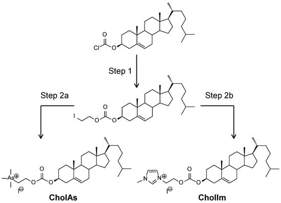 We first report three novel cationic lipids, namely CholAs, CholIm, and CholRi (Figure 1). Briefly, CholAs and CholIm were obtained following two-step synthetic routes (Scheme 1). First, cholesteryl chloroformate was reacted with iodoethanol to produce 2-iodoethylcholesteryl-carbonate. Next, the reaction of the latter intermediate with trimethylarsine on one hand or N-methyl-1,3-imidazole on the other made it possible to obtain CholAs or CholIm, respectively (both in 60% yield). See Supplementary Materials for more details about synthesis and characterizations.