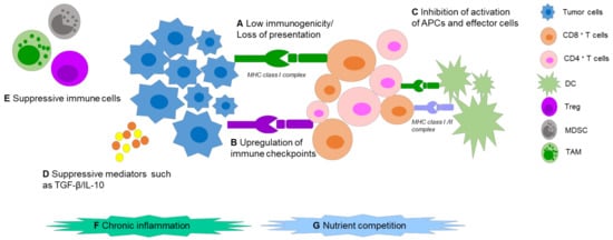 Mechanisms of tumor immune escape. (A) Tumor-associated antigens show low immunogenicity and/or develop several antigen presentation problems. (B) Upregulation of immune checkpoints like PD-1 on T-cell surface or its ligand PD-L1 on tumor surface can cause T-cell anergy and inhibit the antitumor immune response. (C) Low secretion of immune stimulatory molecules in the TME, like IL-2, which inhibits the activation of APCs and other effector cells such as CD8+/CD4+ T cells. (D,E) Production of immunosuppressive cytokines by tumor cells, such as TGF-β and IL-10 and recruitment of several immunosuppressive cells like regulatory T cells (Tregs), Tumor-associated macrophages (TAMs) and myeloid-derived suppressor cells (MDSCs), are able to attenuate antitumor immune response. (F,G) Chronic inflammation and nutrient competition promote immune dysfunction. Abbreviations: MHC (major histocompatibility complex); CD (cluster of differentiation).