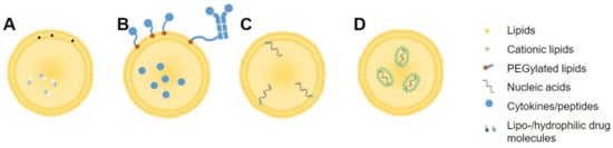 Simplified locations of incorporated or conjugated agents, including (A) drug molecules, (B) cytokines/peptides, or (C) nucleic acids in liposome or (D) solid lipid nanoparticle formulations.