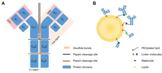Primarily, the IgG class of antibodies is used therapeutically for its relative abundance in the blood, lymph, peritoneal and cerebrospinal fluid. IgGs can be further subdivided into IgG1–4, IgG1 and 3 generally targeting protein antigens, and IgG2 and 4 generally targeting polysaccharides. For use with liposomes, whole antibodies often need to be modified or separated into chains or regions. This can be to reduce steric hindrance on the liposome surface, to increase stealth characteristics of the liposome, or to prevent Fc-mediated recognition by the immune system. Constant domains of antibodies are not directly involved in antigen recognition and binding, but Fc domains may be recognized by the mononuclear phagocytic system (MPS) in circulation, resulting in faster clearance. This effect was demonstrated early in immunoliposome development by Iden and Allen, where anti-CD19 mAb-conjugated immunoliposomes showed negligible targeting and greatly increased clearance compared to untargeted, PEGylated liposomes []. Modifications are commonly carried out by enzymatic digestion at particular residues using pepsin or papain, or chemical reduction of disulfide bonds, using reducing agents such as 2-mercaptoethylamine (MEA), DTT, tris(2-carboxy)phosphine (TCEP) and dithiobutylamine (DTBA) []. Cleavage sites and antibody structures are shown in Figure 5A.