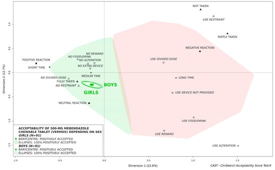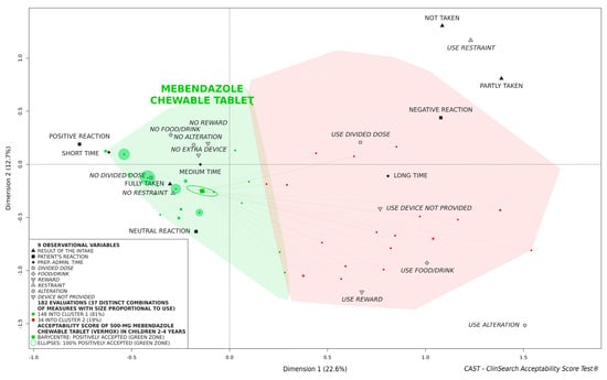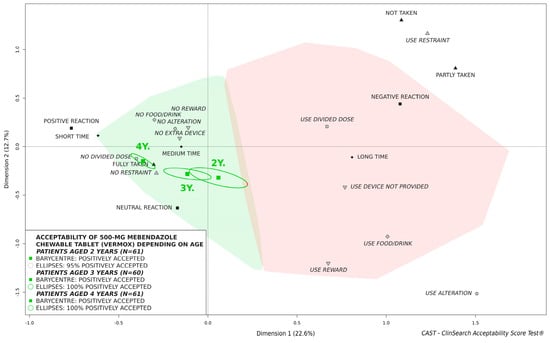 Results found that the acceptability increased as children grew older. The 500-mg mebendazole chewable tablet was significantly better accepted in children 4 years of age, while the barycenter for children aged 2 were closer to the negative area. The medicine was positively accepted in children aged 3 and 4 regardless of studied subpopulations. For children aged 2 years of age, a limited part of the confidence ellipses fell in the negative area of the 3D-map. Nevertheless, the chewable formulation was considerably better accepted than hard tablets in children aged 2 to 4 years, even in the younger children aged 2 years, due to an improvement in the different observational variables. According to the summary of product characteristics (SmPC) the chewable formulation should be to chewed completely before swallowing. For younger children, who have difficulty chewing the tablet, an alternate method of administration by first dissolving the tablet in clean water was permitted according to the SmPC. In this study, the alternate method was used for 30% of children aged 2 years, 15% of children aged 3 years, and 5% of children aged 4 years. Although using this permitted alternate method has an impact on the medicine use (e.g., time of preparation, use of methods to achieve administration), drug effectiveness is ensured by the SmPC. For conventional tablets, manipulations are often off-label and may result in critical issues regarding dosing accuracy and bioavailability beyond acceptability issue [,,,].
