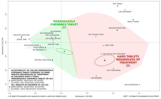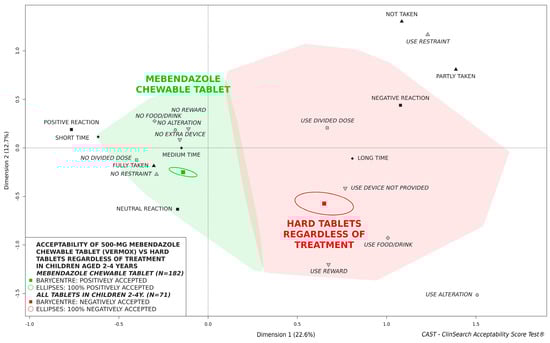 Figure 2 shows the significant difference between the overall score of 500-mg mebendazole chewable tablet in children aged 2 to 4 years and the score of conventional hard tablets in this age group. The latter score was based on 71 evaluations of various tablet intakes in children aged 2 to 4 years regardless of treatment. Table S1 (Supplementary Materials) presents the characteristics of this subset of 71 evaluations from the dataset of 1778 standardized evaluations that gave rise to the reference framework. The barycenter of these evaluations along with the entire confidence ellipses surrounding it, was located in the negatively accepted profile. The difference between acceptability scores was due to important differences between the two subgroups of evaluations for the different observational variables (Table 2).