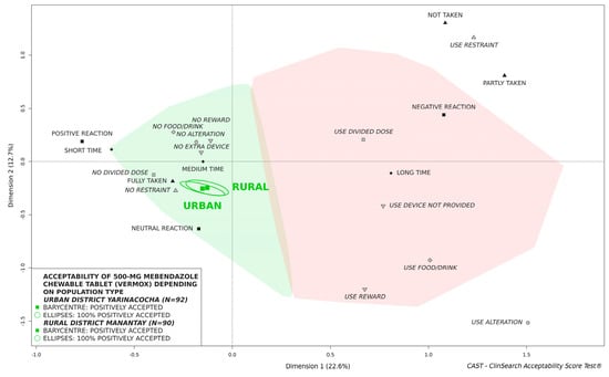 The findings indicate that the 500-mg mebendazole chewable tablet was similarly accepted by boys and girls (Figure 5) as well as children from rural and urban district (Figure 6). Stratifying evaluations by age of children, similar findings were observed: in all cases confidence ellipses surrounding the barycenters for boys and girls as well as rural and urban district largely overlapped.