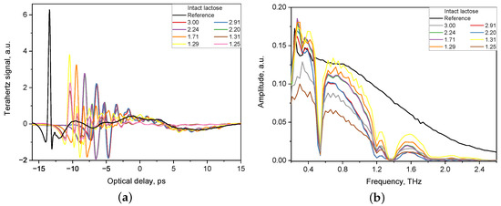 The properties and spectral features of crystalline -lactose monohydrate were previously studied. Several works [12,13,14] confirmed the presence of absorption spectral peaks in the 0.1 to 2.6 THz range at frequencies of 0.53 THz (a peak presumably corresponding to the hindered rotational mode of the -lactose molecule in the crystal), 1.38, 1.82, and 2.56 THz. By using the THz spectroscopic analysis, it is also possible to observe structural changes in a substance in the absorption spectrum at different temperatures [15]. So far, studies on the spectral analysis of -lactose monohydrate fluidized with dilutions of pharmaceutical ingredients in the far-IR range were not performed.