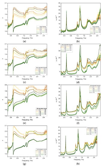 Refractive index (a,c,e,g) and absorption coefficient (b,d,f,h) spectra in the THz frequency range of lactose tablets with different formulations of various thickness (mm): intact lactose (a,b); Abs saturated lactose (c,d); GB saturated lactose (e,f); Technological control (g,h).