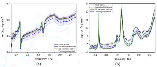 From the entire set of the obtained results on analysis of THZ optical properties of formulations, a sample of spectra of tablets with thicknesses in the range of 1.2–1.3 mm was selected. The sample’s representativeness is justified by the presence of characteristics for two lactose anomers in the 0.2–2.6 THz frequency range, which are more noticeable than for THz spectra of thick tablets and tablets with a thickness of less than 1.1 mm. The THz spectra of optical properties of thin tablets (1.2–1.3 mm) were averaged for comparison and differentiation of various lactose compositions and normalized to their density [40]. The normalized spectra of the refractive indices of the formulations in the regions of normal dispersion and anomalous dispersion coincide with each other (see Figure 3a). Figure 3b shows that the normalized spectra of all lactose formulations have characteristic absorption bands of lactose, the maxima of which are located at frequencies of 0.53, 1.38, and 1.82 THz. The shape of the normalized absorption spectra of the tablets is the same for all formulations, while their difference in band intensities is noticeable, especially in the range from 1.6 to 2.0 THz. Also, differences in the intensity of spectra in the 1.8–2.0 THz region, which corresponds to the -anomer of lactose monohydrate, are present for all tablets.