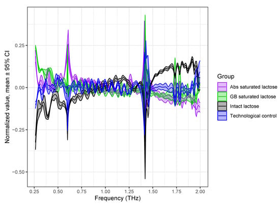 Scaled THz absorption spectra of lactose with different formulations preprocessed by normalization to SNV and mean centering of data. Spectra are presented as mean line with 95% confidence interval region.