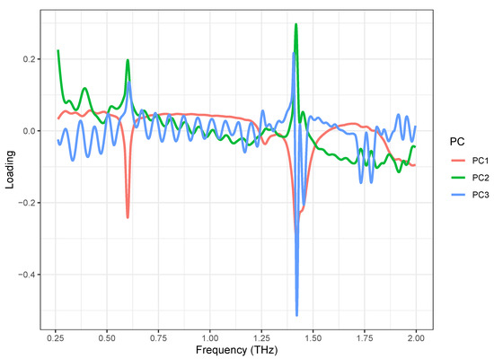 The PCA loading plots are shown in Figure 5. The loading of the first principal component (PC1) (red) showed two strong negative peaks at 0.53 and 1.37 THz, which correspond to the absorption of the -anomer of lactose monohydrate, and a weak negative peak at 1.21 THz, which corresponds to the -anomer of lactose monohydrate. It also showed a negative band in the 1.8–2.0 THz range, which corresponds to the -anomer of lactose monohydrate. It also showed a negative band in the 1.8–2.0 THz range, which corresponds to the -anomer of lactose monohydrate. The loading of the second principal component (PC2) (green) showed the strongest positive peak at 1.37 THz and weak positive peaks at 0.53 THz, which correspond to the absorption of lactose monohydrate. The loading of the third principal component (PC3) (blue) showed only a strong negative peak at 1.37 THz, which corresponds to the strongest absorption of the -anomer of lactose monohydrate. Over the entire spectral range, the loading of PC3 had a noise load. These results indicate that the PCA was successful, and the lactose formulations can be distinguished based on the first two principal components. Though PC1 and PC2 loadings look mostly mirrored, the significant differences can be observed at a band around 1.75 THz, which means the samples separated based on PC2 mostly differ in that range.