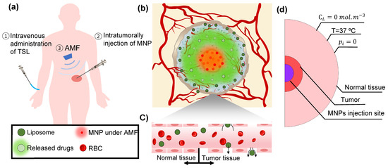 Among several thermal therapy candidates, MHT, which uses magnetic nanoparticles (MNPs), exhibits acceptable results in clinical trials as a minimally invasive treatment [9]. MNPs, in particular iron oxides (Fe3O4), have shown great potential in biomedical applications due to their low toxicity and biocompatible nature [10]. A direct intratumoral injection of MNPs has shown reliable performance in preclinical and clinical studies due to providing a high concentration of particles [11,12,13]. The most significant advantages of MHT are deep tissue penetration, local and homogeneous heat, and the direct delivery of therapeutic heating to cancer cells [14]. However, MHT has received immense attention in recent years; adequate heating of the entire tumor volume is not possible due to many biological restrictions [15,16]. Thermosensitive liposomes have proven to be a successful tool in combination with local hyperthermia or thermal ablation because it can synergistically induce tumor elimination as a result of both high temperature and drug delivery [17,18]. The development of strategies that would allow MNP encapsulation within liposomes to induce local therapeutic hyperthermia has shown beneficial outcomes in previous studies [19,20,21,22]. The feasibility of the administration of TSLs combined with MHT has been reported in regard to the use of thermo-sensitive magnetic liposomes, which co-encapsulates MNPs and anticancer drugs [22,23]. Despite the recent advances in magnetoliposomes, some unsolved problems still exist. The insertion of nanoparticles into liposomes is limited by the thickness of the membrane, which is approximately 3.4 nm thick, so the incorporation of larger MNPs into liposomes is a formidable task [24,25]. Furthermore, the encapsulation of drugs, stability of nanoparticle-embedded liposomes, and purification of non-encapsulated magnetic nanoparticles are the other major problems [26,27]. There exist many computational and experimental studies on applying stand-alone MHT [28,29,30,31] or magnetoliposomes [32,33,34,35,36] to solid tumors, but there is a lack of studies on the intravenous administration of TSLs in combination with MHT.